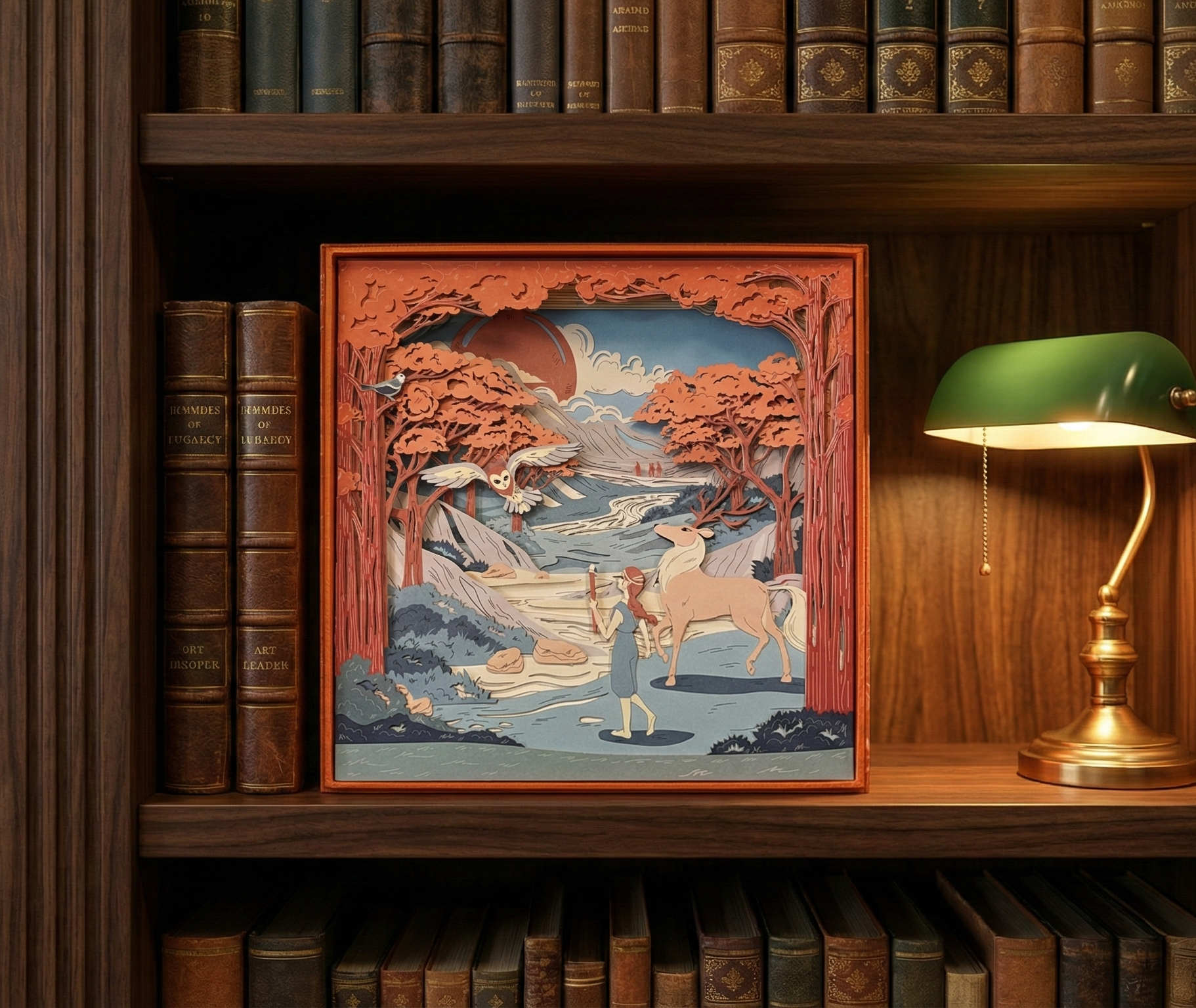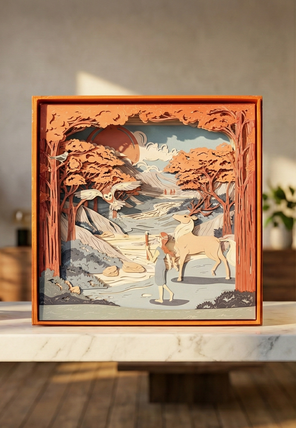 The scenery is made of 10 laser-cut layers stacked up and inserted in a decorative box acting as the eleventh layer.
