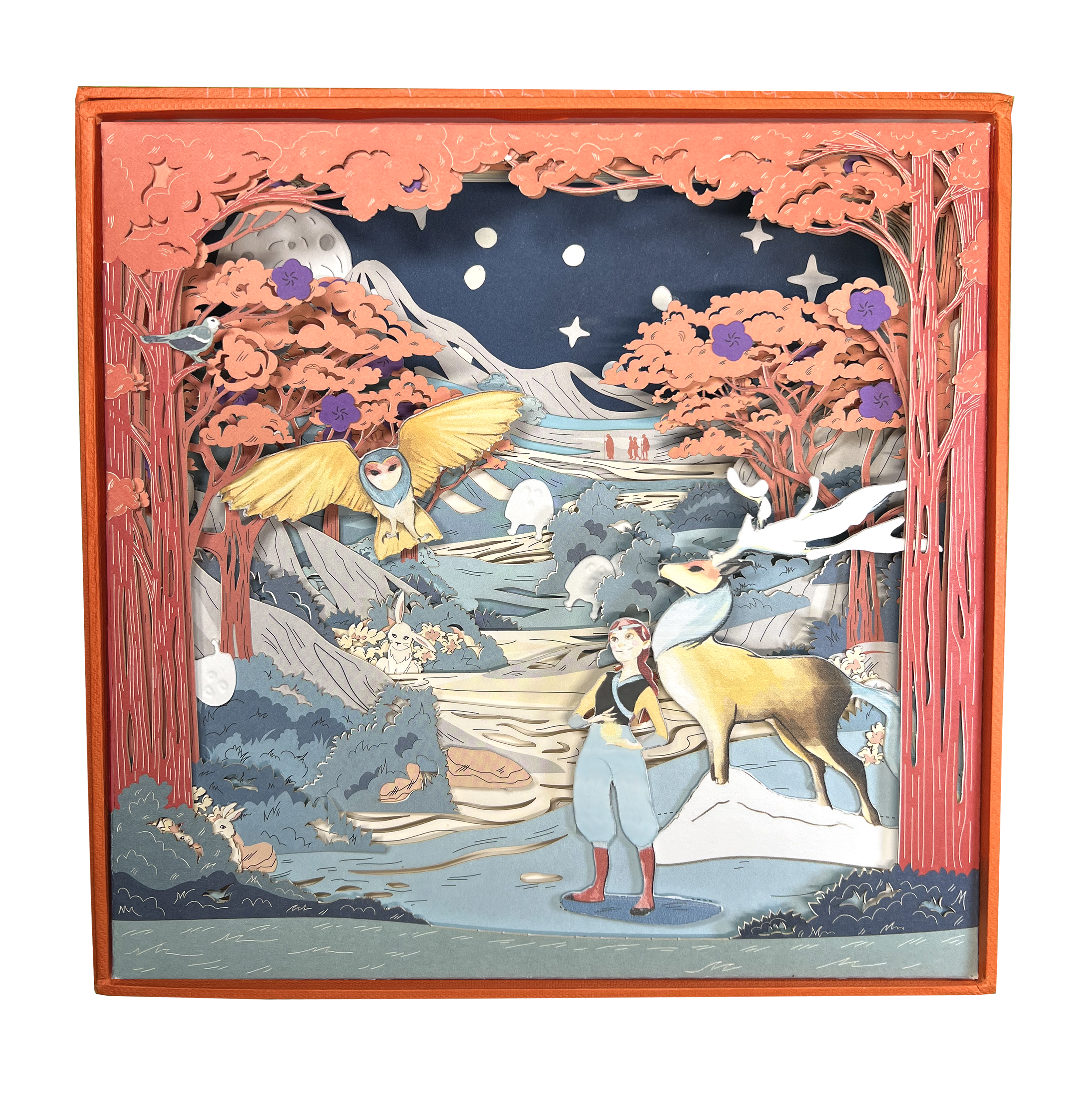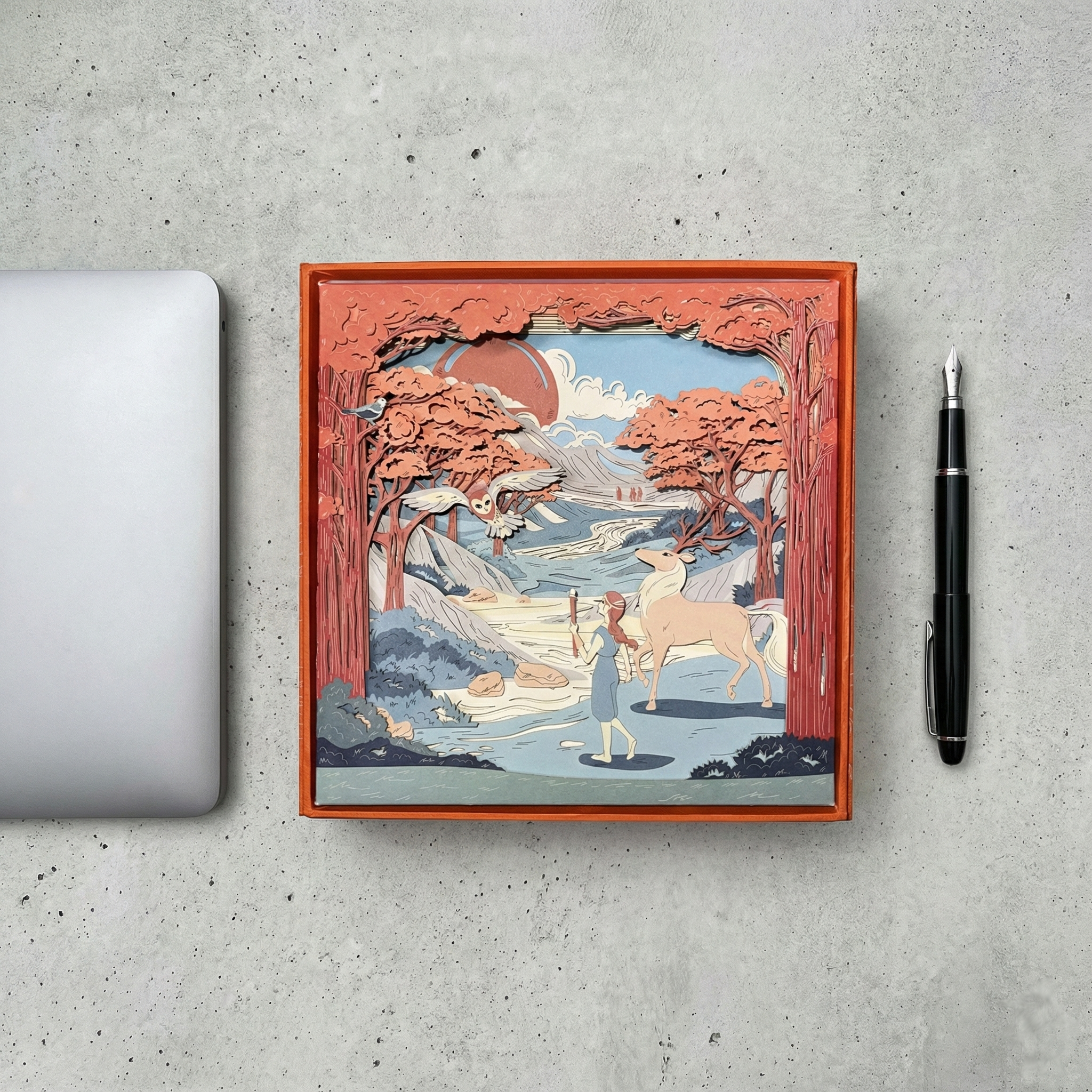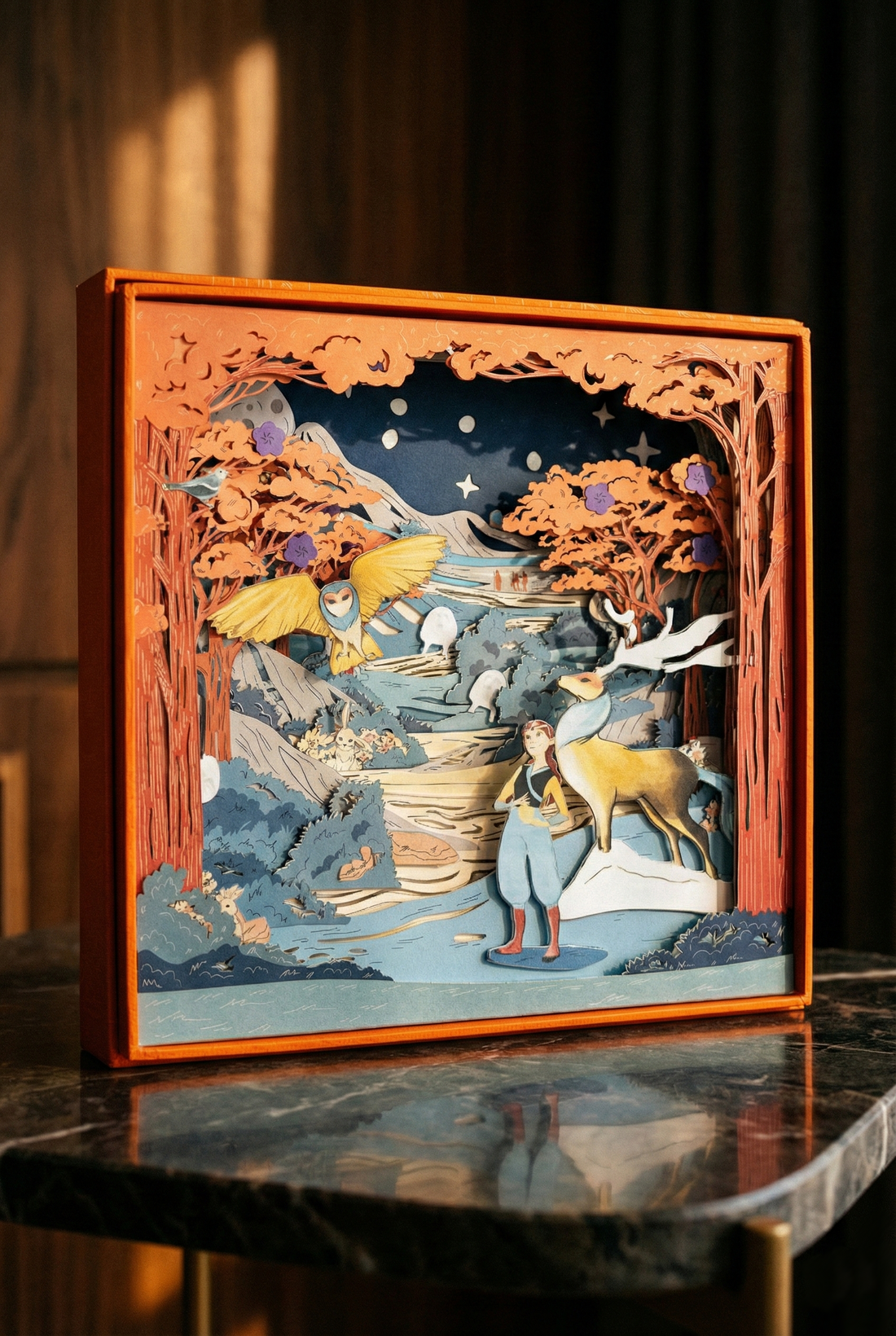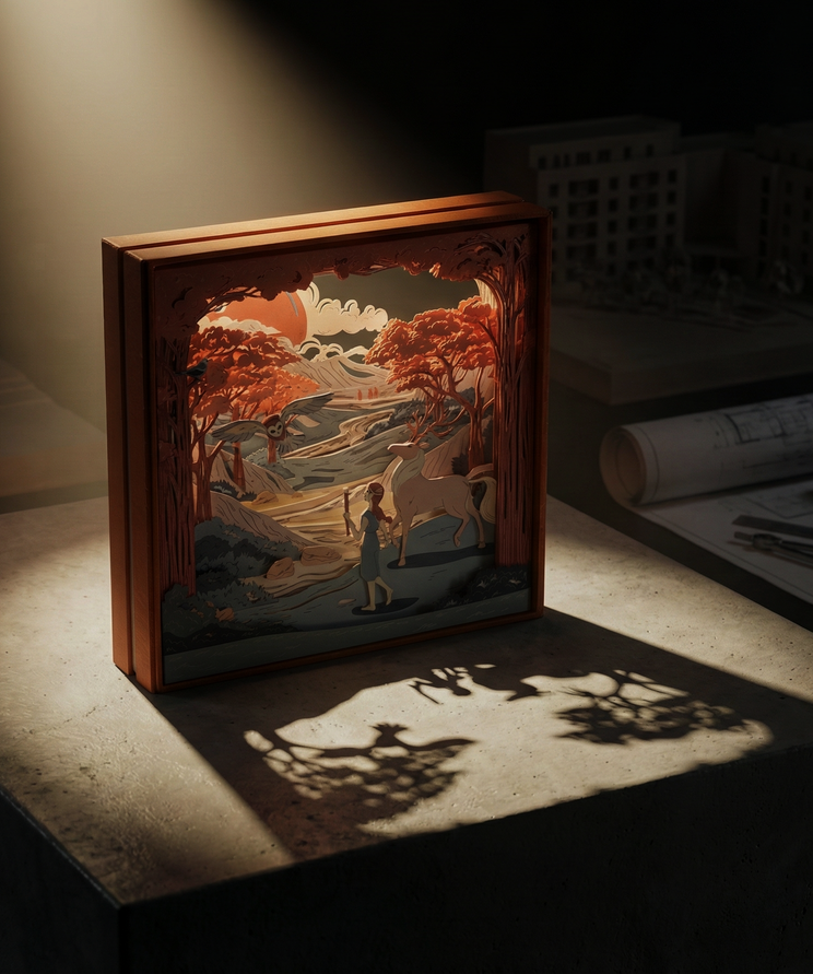 The scenery is made of 10 laser-cut layers stacked up and inserted in a decorative box acting as the eleventh layer.