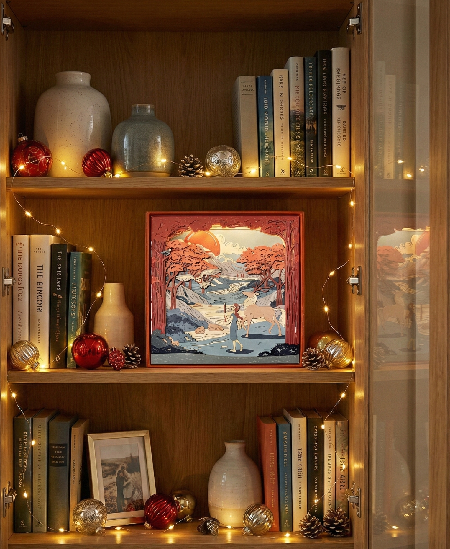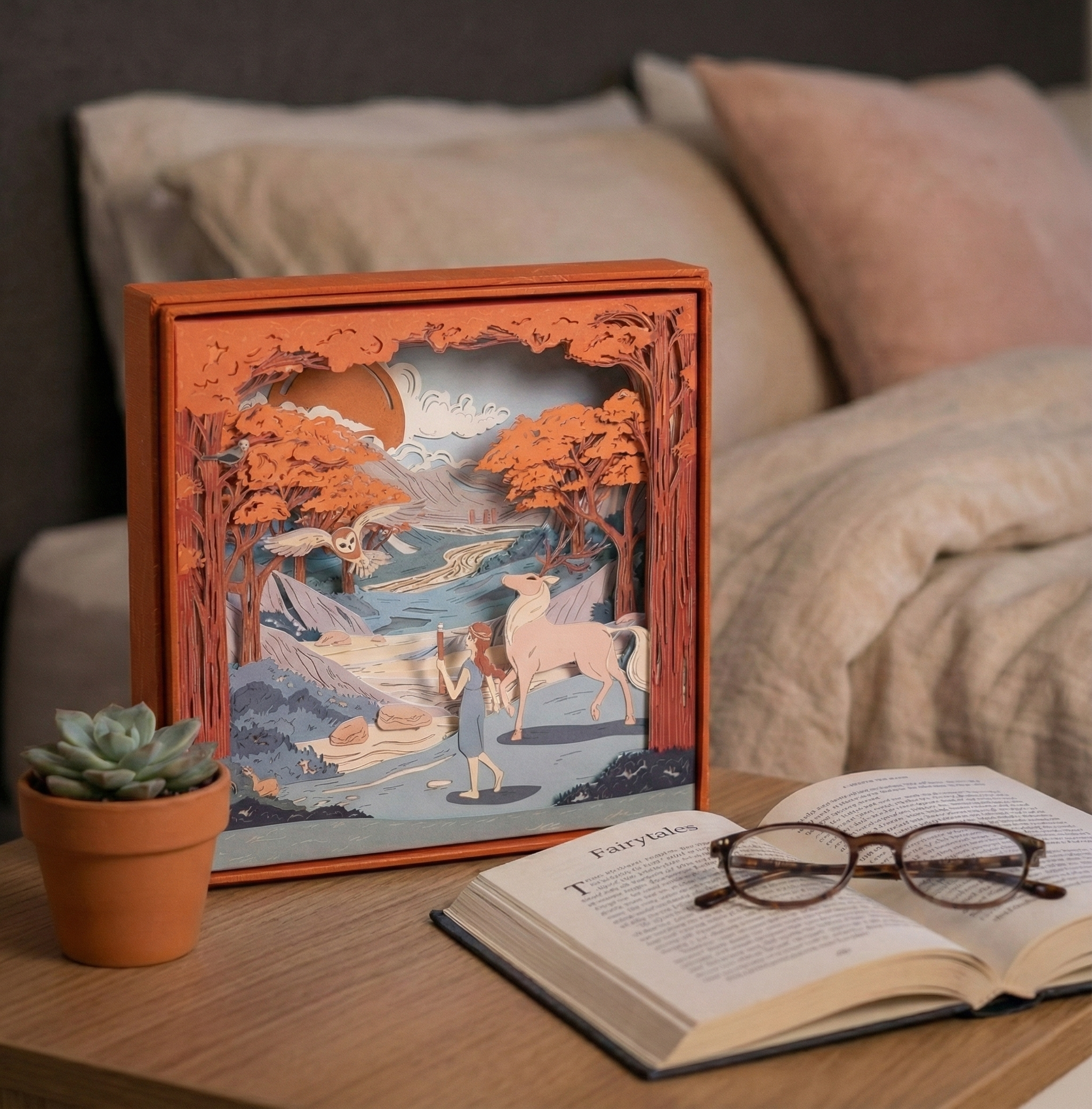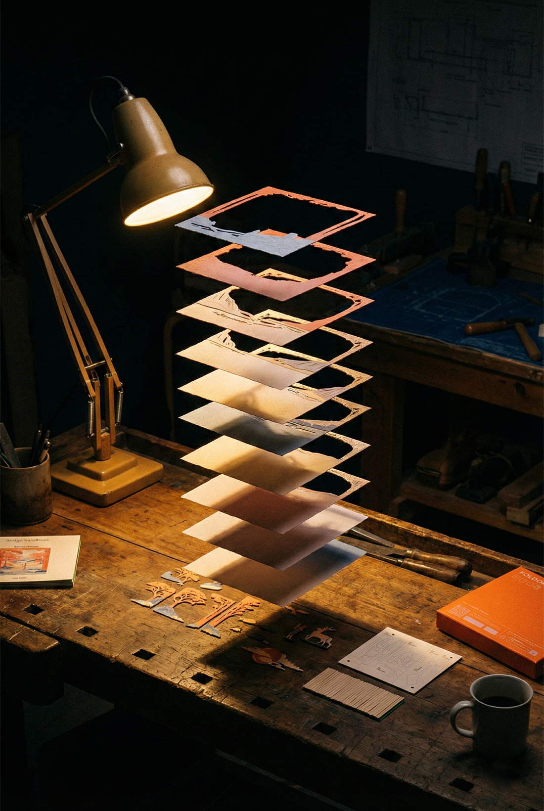 The scenery is made of 10 laser-cut layers stacked up and inserted in a decorative box acting as the eleventh layer.