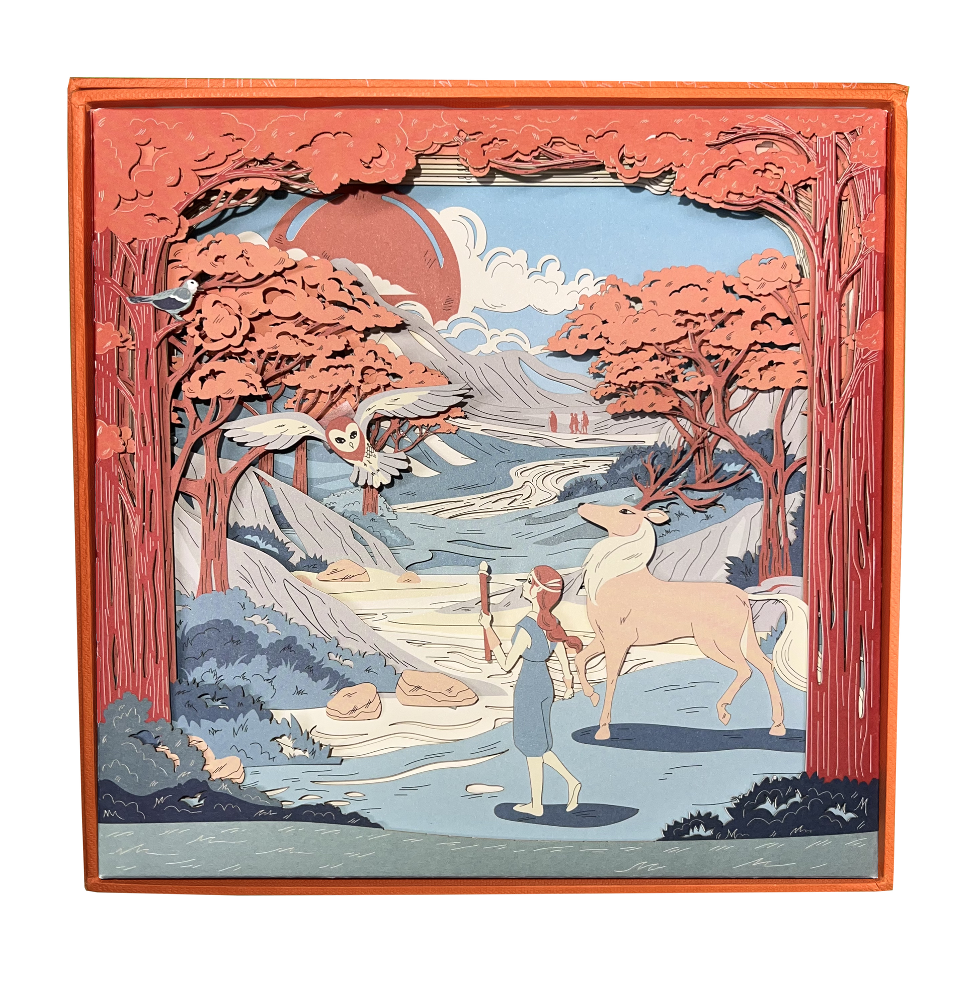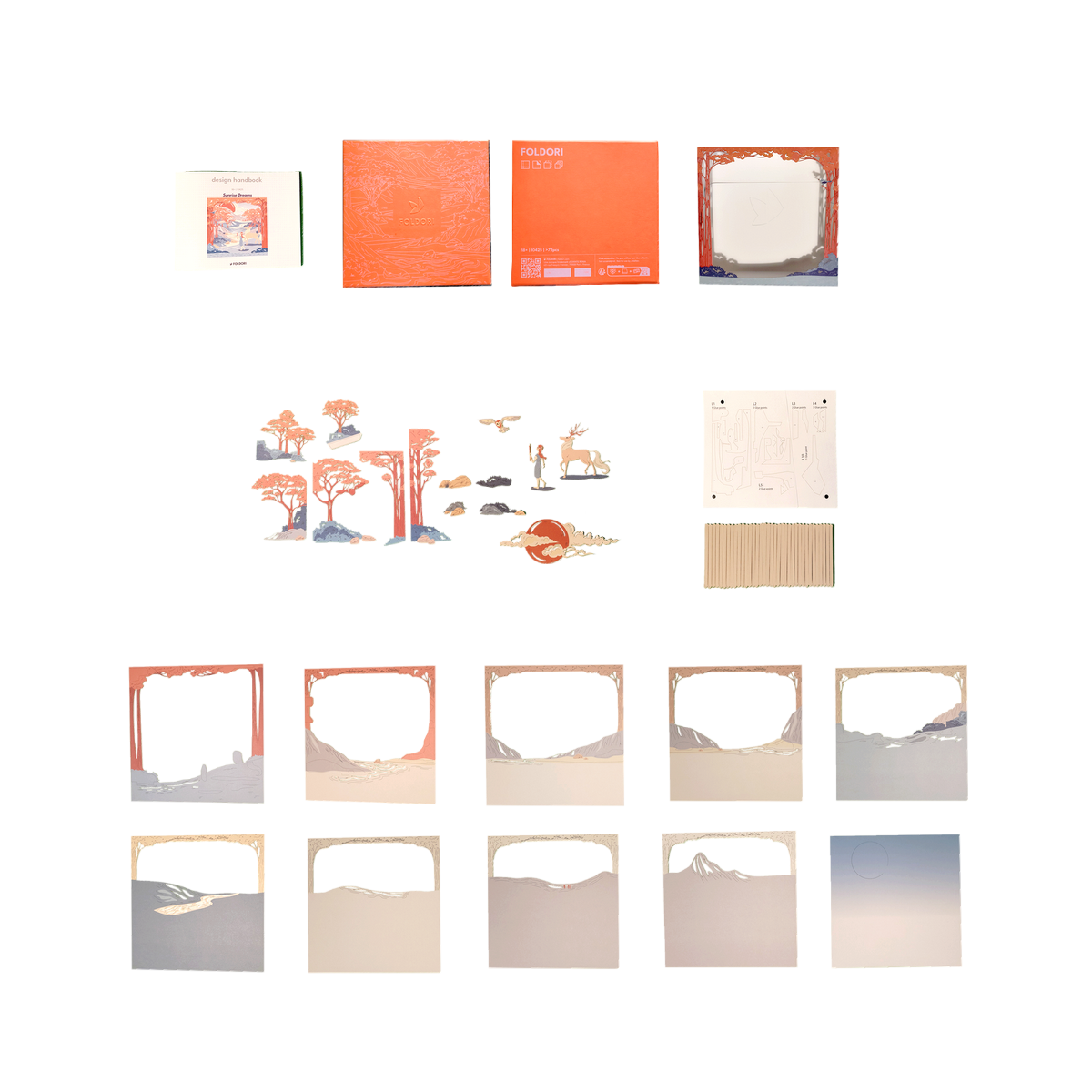 A premium craft set filled with all the materials necessary to the self-assembly of a paper-based, multi-layered scenery.